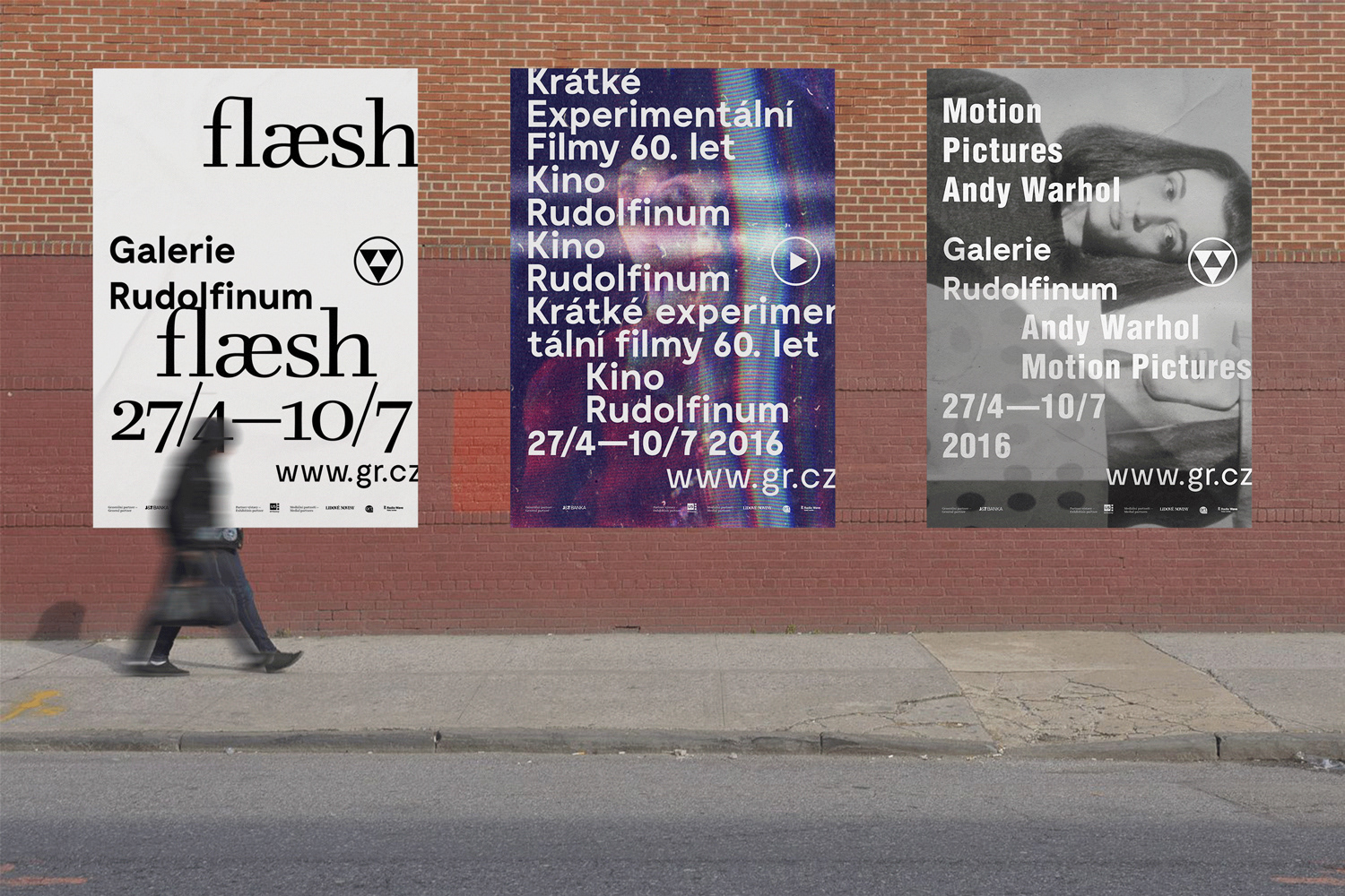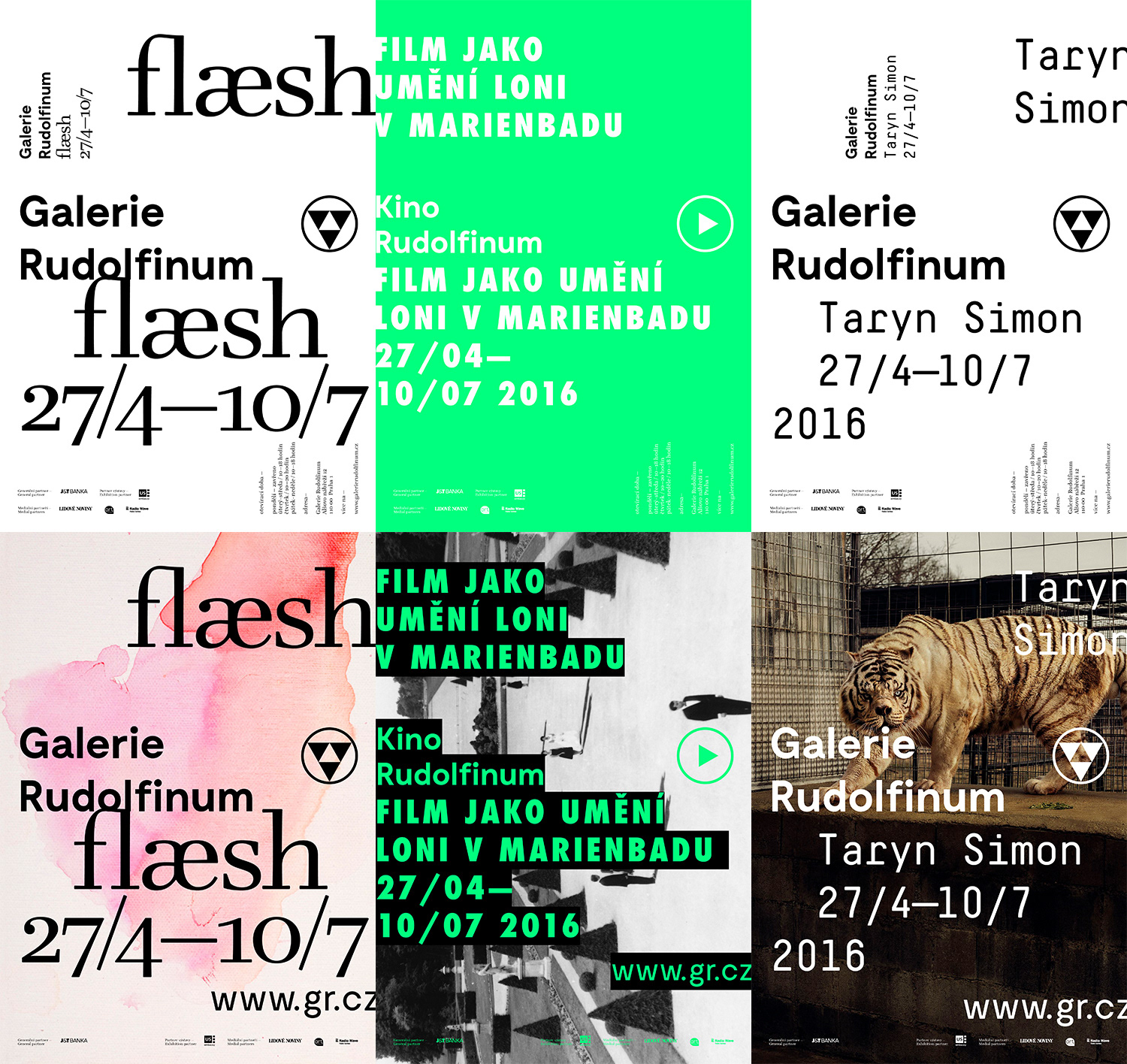 Realizace značek rozšiřujícího programu Galerie Rudolfinum – Kino Rudolfinum a edukativní centrum Artpark – a náhled integrovaného vizuálního stylu.